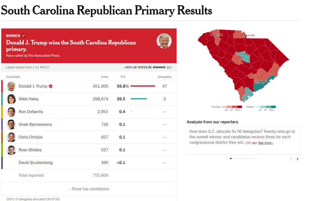 Yesterday was the South Carolina primary and like with Iowa it served as a message to the Republican voters weather they wanted to give Trump another shot or move on and let him rot in jail and endorse the old losers that came before him. Well like with Iowa it showed that no in fact Republican voters don’t want to go back to the Ted Cruzes and Reagan larp shit that has failed them for the last 30 years.